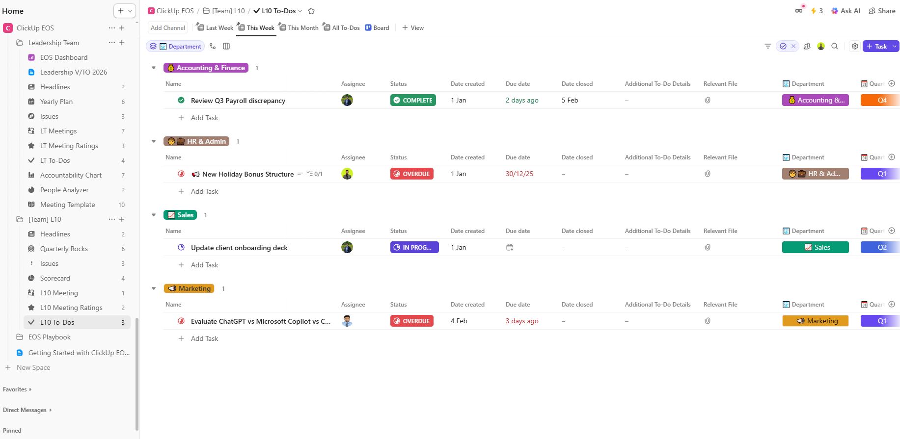 ☑️ Automations that support EOS compatible cadence – Status changes, reminders, and task creation are automated to reduce manual follow-ups.