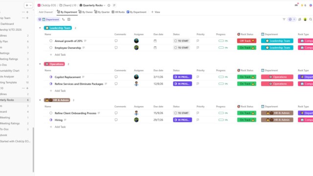 It’s a powerful ClickUp workspace built to run your entire business - from vision and traction to tasks, meetings, and SOPs - all in one place. This is EOS compatible designed to scale, systemize, and simplify how you operate.