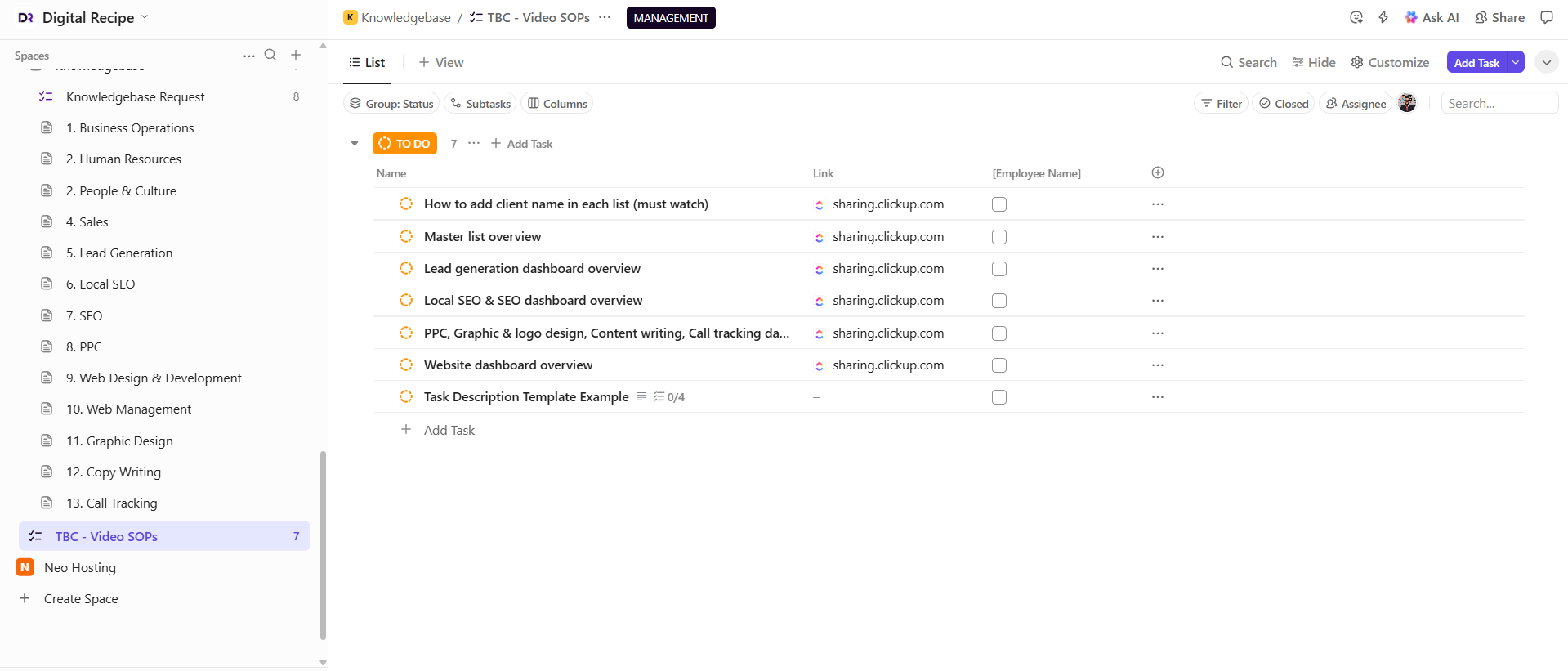 ClickUp for digital marketing agency operations, creating a scalable, high-visibility system.