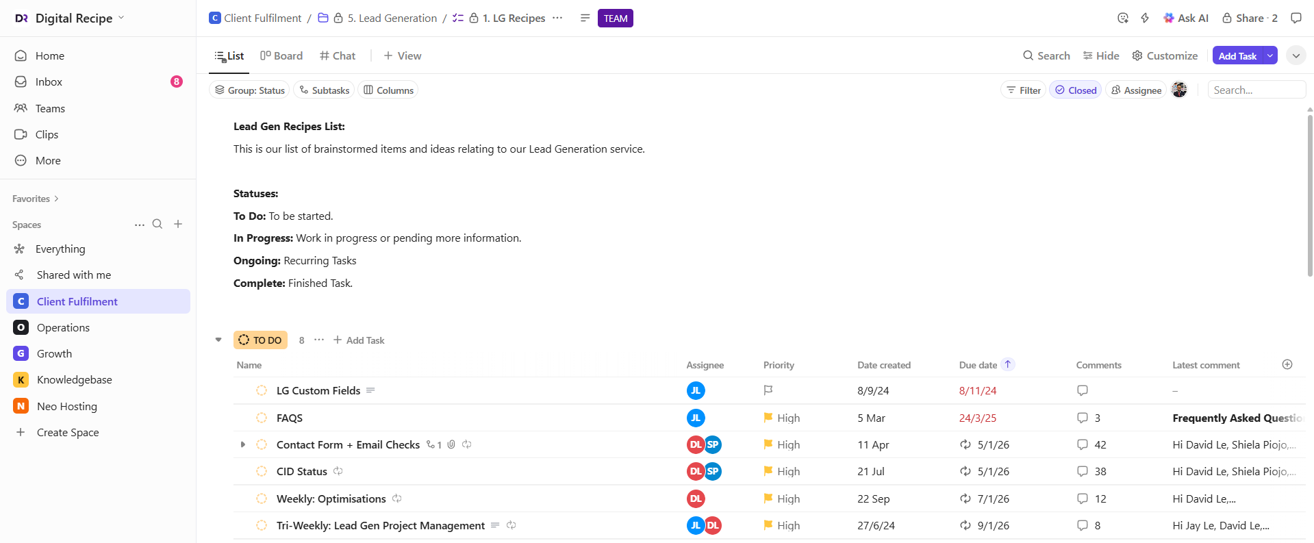 With ClickUp for digital marketing agency operations, Digital Recipe eliminated operational debt and gained real-time clarity across clients and services. The new system delivered measurable outcomes for the agency: